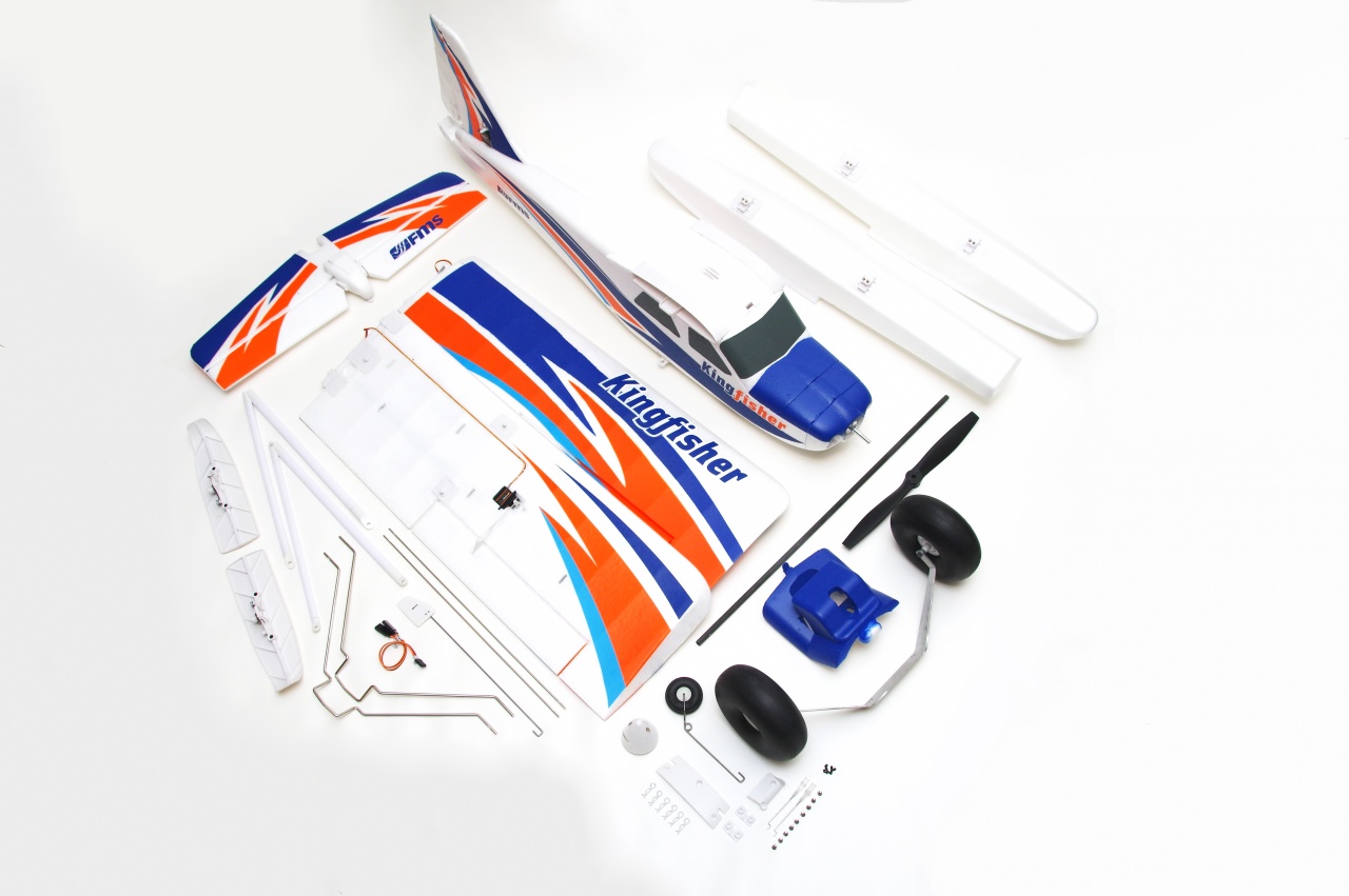 Der Kingfisher mit einer Spannweite von 140cm aus EPO Schaum ist ein perfekter Trainer nicht nur für Einsteiger. Das Modell lässt sich mit seinen großen Rädern von fast jedem Untergrund starten und landen. Der Auf- und Abbau ist sehr benutzerfreundlich und dank seiner Steck- und Schraubkonstruktion gelingt dieses in wenigen Minuten. Der Zugang zum 3S Lipo erfolgt durch die abnehmbare Kabinenhaube. Mit dem bereits eingebauten Brushless Motor und Regler sind Flugzeiten von 12-15 Minuten möglich. Der Kingfisher wird in der PNP Version mit eingebautem Antrieb und Servos angeboten.